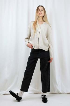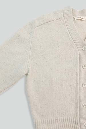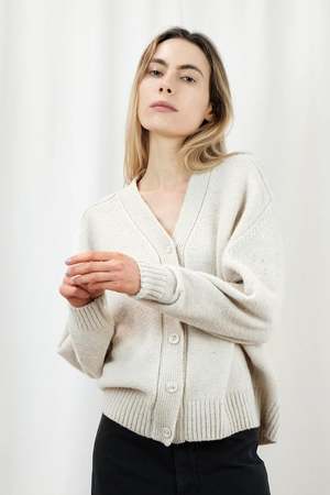 Easy / relaxed fit cardigan in a saddle seam sleeve in soft merino boucle. Featuring speckle yarn mix detail. - 85% Merino Wool / 15% Polyamide - Made in USA - Model wears size M - Model Measurement: Height-5'10", Chest-33", Waist-24', Hip-34" Size S M L Chest 46" 48" 50" Length 22" 23" 24" Sleeve Length (from neck) 26" 27" 28" Bottom Sweep 38" 39" 40"