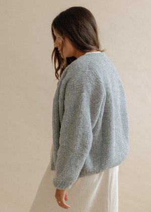 the sweetest cardigan that reminds us of a cloud a beautiful soft blue that pairs so nicely with denim or any color you choose to layer models are wearing a size s 89% baby alpaca 11% polyamide Micaela Greg