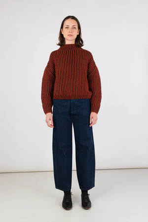 High neck sweater in two-tone plaited knit. Sweater features a relaxed, boxy silhouette with dropped shoulder and sculptural sleeve. Cropped length gives balance to the boxy body. Designed in California and produced in Peru using locally sourced alpaca yarns colored with GOTS certified organic dyes. Made in Peru 70% Baby Alpaca, 7% Merino Wool, 23% Polyamide Measurements: S: Chest 44" | Length 19" M: Chest 46" | Length 20" L: Chest 48" | Length 21"