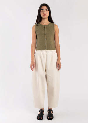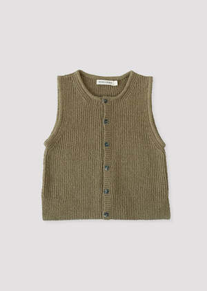 - Micaela Greg - Boucle Rib Vest in Ivy - Mid weight organic cotton vest with delicate ribbed boucle texture. - Tubular Knit Trim at neckline and armhole - Small side slit at seam - 100% Organic Cotton