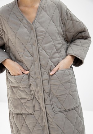 Long quilted jacket in lightweight cotton sateen with poly fill. Large diamond pattern, exposed binding at armhole and side seam. Rounded hem detail at bottom. Small ring snap closure. - 100% Organic Cotton w/ Poly Fill - Model is 5'9" and wears size S Made in India