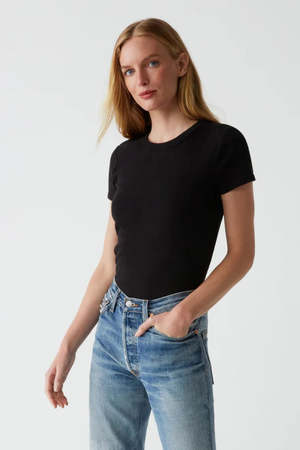 The Lexy tee is the definition of classic. This tee has a body skimming fit, features a capped short sleeve that hits just right and a crew neck with wide binding. Made from our bestselling 1x1 Cotton fabric that is a heavier weight cotton rib that washes well and keeps it shape. For a similar fit as our original one size style, we recommend a size medium. Details - Fabric: 1X1 Cotton: 100% Cotton - Care: Machine Wash - Fit: Fitted - Style: 1801SIZ - Origin: Made in USA