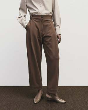 High-waisted, barrel-legged, and ready for everything: meet the Fall trouser by Mijeong Parka modern take on a beloved classic. Finished with pleat detailing at the hip, side-seam pockets, and an adjustable button-detail waistband, these pants are cut to the ankle. Dress them up or down all season long. - 74% Polyester, 20% Rayon, 6% Spandex - Made in China | Fabric made in South Korea