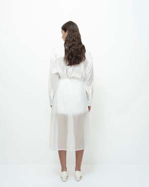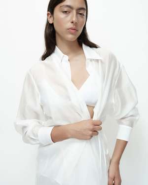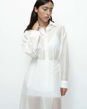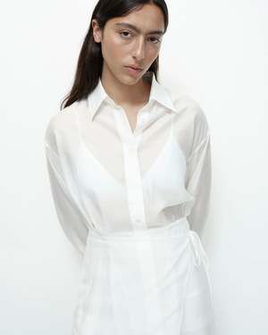 Oversized shirt Semi-sheer tencel blend fabric 84.5% Tencel, 15.5% Polyester Dry clean Imported, China. Fabric made in South Korea. Model wears size small. Model is 59. Designed for an oversized fit. Take your usual size for the intended look or go down a size for a neater look. Bust: XS-48, S-50, M-52, L-53 1/2 Length: XS-31, S-31 1/2, M-32, L-32 1/2