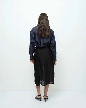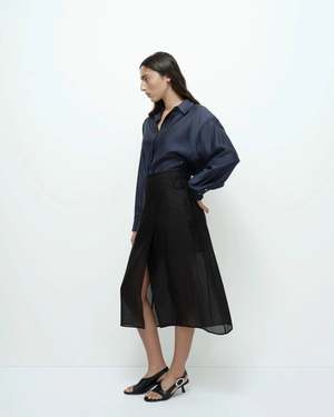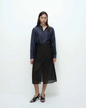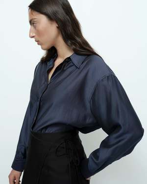 Oversized shirt Semi-sheer tencel blend fabric 84.5% Tencel, 15.5% Polyester Dry clean Imported, China / Fabric made in South Korea Model wears size small. Model is 59 Designed for an oversized fit. Take your usual size for the intended look or go down a size for a neater look. Bust: XS-48, S-50, M-52, L-53 1/2 Length: XS-31, S-31 1/2, M-32, L-32 1/2