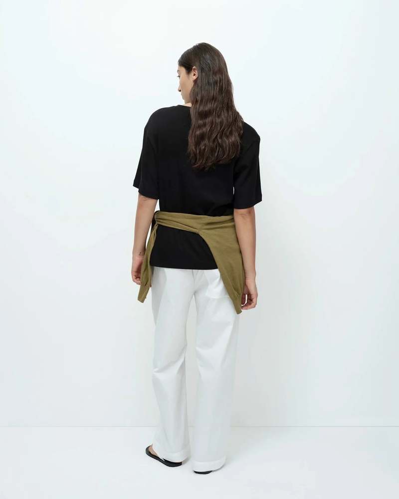 The perfect T-shirt with an oversized fit, dropped shoulder, and a crew neck cut. Made with 100% cotton. Hand wash cold. Type: T-shirt. Sustainability Made slowly and ethically in China with 100% cotton. Sizing info Model wears size small. Model is 59. Bust: XS-39, S-41, M-42 1/2, L-44. Length: XS-25, S-25 1/2, M-25 3/4, L-26.