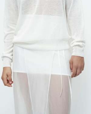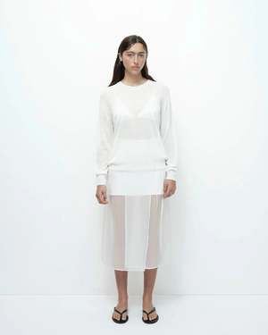 Light-weight linen blend knit Relaxed fit Crew neckline Slip-on style Long sleeves Rib trim at cuffs and hem 10% linen, 25% rayon, 65% acrylic Dry clean Imported, South Korea Model wears size small. Model is 5 9 Designed for a relaxed fit. Back length: XS-23 1/2, S-24, M-24 1/2, L-25 Bust: XS-38, S-40, M-41 1/2, L-43