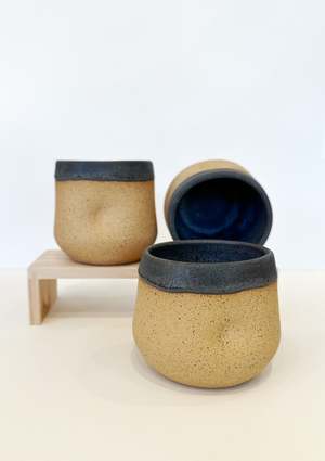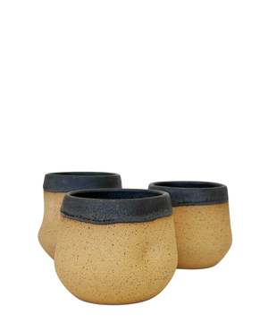 Set of two ergonomic mugs designed to feel like a gentle hug in your hands. Their softly contoured form sits naturally in the palm, creating a comforting and grounded drinking experience. Each mug holds approximately 8 oz and is carefully handmade and hand-built, one at a time. The exterior reveals the clay's natural texture, offering a warm, organic touch, while the interior is finished to be safe for both hot and cold beverages. Subtle variations in shape and surface reflect the authenticity of true craftsmanship no molds, no replicas just intentional design shaped by hand. Materials & Care: CLAY: Light brown with black speckles. GLAZE: Semi-matte charcoal color. Handcrafted from USA-sourced clay. Unique, mold-free, small-batch production. Glazed finish (not microwave-safe). We recommend handwashing to prevent surface decay and scratches. Please note that slight variations in size may occur due to the clay's natural behavior during drying and firing.