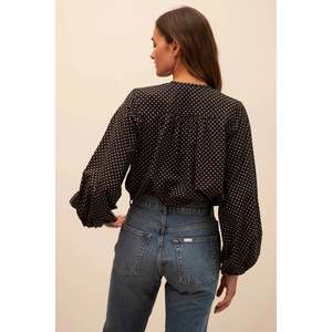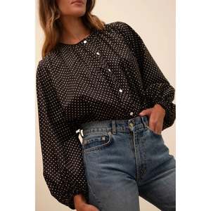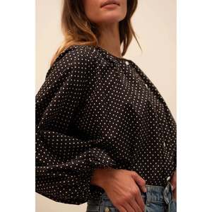 Collarless, button down blouse with a twist. Fitted through the shoulders, loose through the body with voluminous, long sleeves. 100% cotton Size and Fit: - XXS Length: 25", Chest: 41" - XS Length: 25.5", Chest: 43" - Small Length: 26", Chest: 45" - Medium Length: 26.5", Chest: 47" - Large Length: 27", Chest: 49" - XL Length: 27.5", Chest: 51" Material: 100% Cotton MPN: S70247