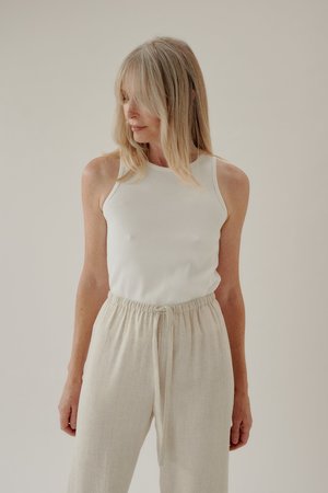 Description New to Mina, the Ribbed Tank in Off White is one of two cotton layering styles to wear with our high waisted pants and skirts. A wardrobe staple crafted in a vertically ribbed fabric with binding around neckline and arm holes. Featuring a high neckline and underarm with 5% Spandex gives this tank a secure fit. Outfit this piece with the Studio Pant or one of our Moi Pant or Mali Pant colourways. This item is exclusive to Mina and cannot be found at any of our retailers. Details - 95% Cotton 5% Spandex - High neckline and underarm - Vertical ribbed fabric - Firm secure fit - Binding around neckline and armholes - Exclusive to Mina Model Details Amanda (blonde) wears a Mina size 8, Height: 180cm, Bust: A Cup, Waist: 66cm, Hip: 96.5cm Derya (brunette) wears a Mina size 8, Height: 178cm, Bust: DD Cup, Waist: 63cm, Hip: 89cm Fabric & Care Corded Rib 95% Cotton 5% Spandex Cold hand wash or delicate machine wash Click here for our Fabric Library Who made this garment? Pattern Maker: Michelle Procter (In House), Auckland Grader: Chris, Jacata Bureau, Auckland Maker: Cut and Stitch, Botany, NZ