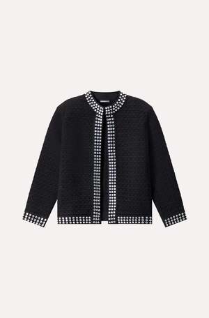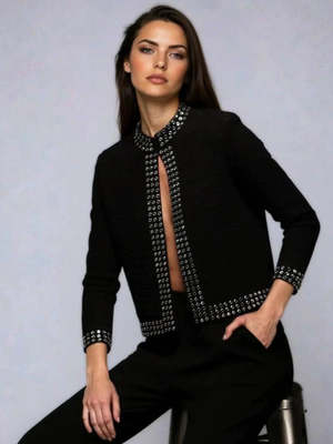 This elegant black jacket features sleek silver stud detailing along the collar, front trim, hem, and cuffs for a refined statement look. Designed with an open-front silhouette, its the perfect layering piece to elevate both casual and dressy outfits. DESIGNER ID: 95136 Color: Black Composition: 40% Nylon, 30% Alpaca, 30% Wool Care: Dry clean or machine wash Fit: True to size Imported.
