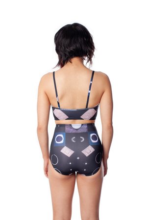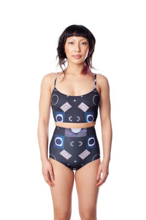 Top with scooped neckline and thin straps in our Maggie Groat x Minnow Bathers print. Each Maggie Groat x Minnow Bathers piece is one of a kind and features a different motif from the collage, Psychic cost > power variations. This print is included in our 2021 line, Cosmic Ocean. Psychic cost > power variations (2017) is part of an ongoing study into imperfect symmetries and patterning. Composed of found and modified images taken from the margins of 20th century printed matter, and through processes of decontextualizing, fragmenting and halving, a proposal, a map, a power-image, emerges. These bottoms are constructed from high quality recycled spandex and digitally printed in Montreal.