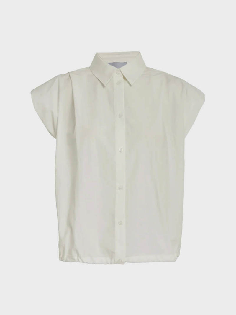 Cotton shirt with a collared neckline, button-down front, short sleeves, and a bubble hem. Composition: 60% Cotton, 25% Lyocell, 15% Polyester.