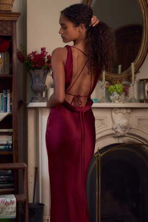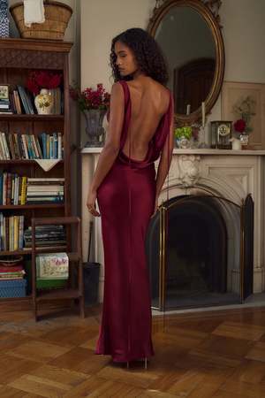 A plunging back cowl gown that can be worn in a variety of ways with functional ties at the back of the neck and silk buttons at the waist. Designed in New York. Composition: 100% Silk (dye lots may vary). Dry clean only. Fit: Fits true to size; model is 5'9" and wears the size XS. Her measurements are: Bust: 32", Waist: 24", Hips: 35". See size guide in images for more details.
