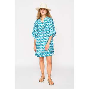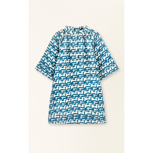 Short dress with a banded neck collar and gathered detailing at the neckline. Features a front button placket, wide elbow-length sleeves, and side pockets. Roomy fit. Medium-weight fabric. - Shell: 100% cotton - Lining: 100% cotton Made in India.