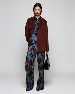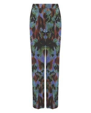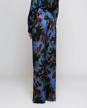 Fluid blue trousers with brushstroke print. High rise waistband. Concealed hook & button closure. Straight fit. Ironed pleat at center front. Singular trousers highlighted by a creative print that harmonizes with your style and adds maximum comfort. 97% Rayon, 3% Elastane Made in Spain.