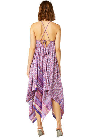 A new silhouette from Misa made to turn heads, the Delfina is handcrafted from a sleek geo print satin. A braided v neckline leads into a crisscross open back with adjustable tie detail. An asymmetric handkerchief skirt exudes bohemian femininity. Pair with sandals for a daytime look or add heels for an elevated evening look. 100% poly satin made by Misa Los Angeles
