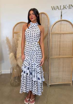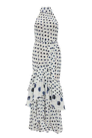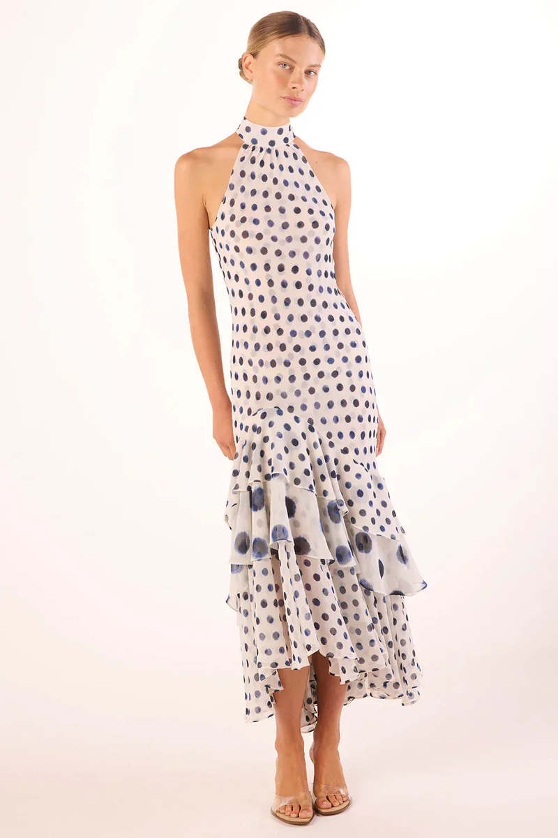 The Eliana dress from Misa Los Angeles makes a beautiful return for spring. Crafted from chiffon printed with navy blue polka dots on a white background, its main silhouette is accented with small dots, contrasted by ruffled panels with larger polka dots for added dimension. Designed with a halter neckline and a buttoned keyhole closure at the back, this flattering asymmetrical midi dress features a tiered ruffle hem and a removable self-tie belt to define the waist. Easy to slip on, it pairs perfectly with heels and a clutch for your next outing. Description: - Straight fit - Halter neckline with button closure at back - Removable self-tie belt - Tiered ruffle hem - Pull-on style - Fully lined - Color: White with navy blue polka dots - True to size - Model is 5'10.5" (Waist: 23.5", Bust: 31", Hips: 35") and wears size XS - 100% polyester chiffon - Dry clean only - Made in the United States
