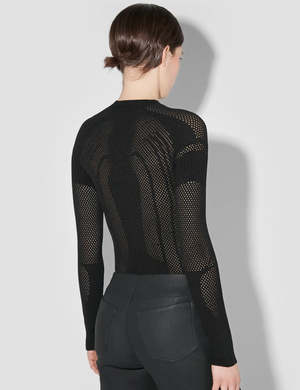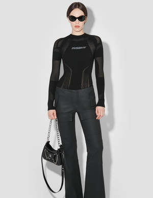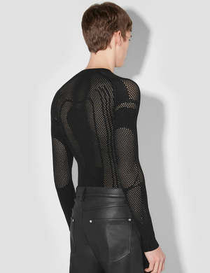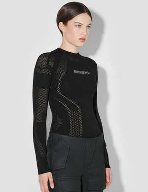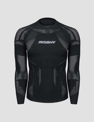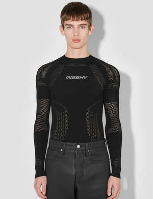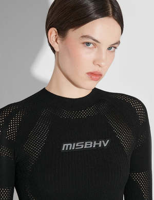 Fitted long-sleeve shirt by Warsaw-based MISBHV in black. Openwork pattern throughout. Sporty and cool to style in a variety of ways. Details: - By MISBHV - Color: Black - Fitted fit - Logo patch - Raglan sleeves - Rib-knit crewneck, hem and cuffs - Unisex product - we recommend a smaller size for women - Composition: 83% recycled viscose, 17% polyester - Luke is 185cm tall and wears size M - Maja is 177cm tall and wears size XS/S