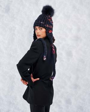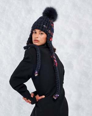 material | 100% fine merino wool, hand spun and hand crocheted at our soho studio in our signature chunky style design | the nolita - one xl pom on top, crocheted straps size | regular - 22.5" our classic beanie, the perfect fit deep - 23.5" additional length and width provide extra warmth and coverage please keep in mind that our pieces are handmade and sizes are approximate