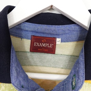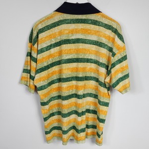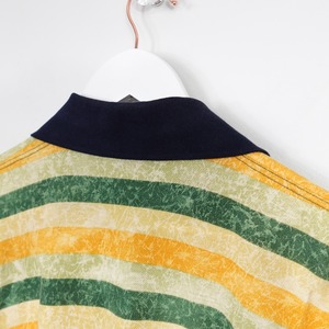 Green, yellow, and navy striped polo shirt in men's size large. Good vintage condition with minor marks and wear. 100% Cotton Made in Italy Measurements laying flat (approximate): - Pit to pit: 23.5 in - Length: 26 in - Sleeve length: 8 in