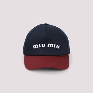 Women > Accessories > Hats Miu Miu blue and bordeaux cotton hat in a baseball cap design. Crafted from cotton with an embroidered logo2 on the front. Velcro strap at the back for an adjustable fit.