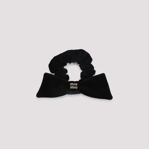 Women > Accessories > Hats Miu Miu black cotton hair pin with an elastic design, tonal bow on top, and a gold-tone metallic signature logo2.
