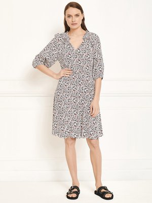Featuring a fresh blossom print, the Roklo Dress from MKT Studio is an easy-going option for summer. Cut to the knee, this pretty print dress is crafted from a soft, fluid fabric with a slightly gathered waist. Finished with 3 / 4 sleeves and a V Neckline with small gathered ruffles. - Gathered waist - 3 / 4 sleeves - Gentle wash
