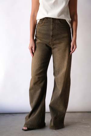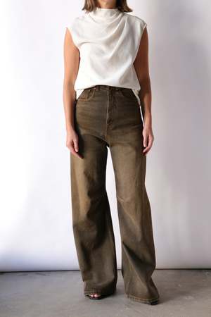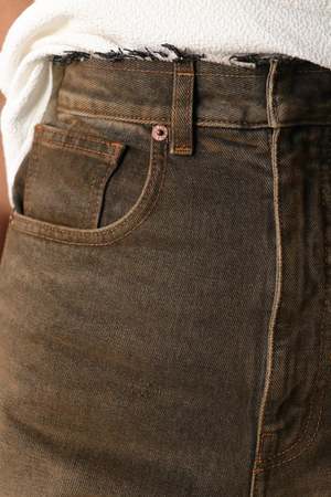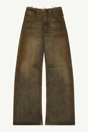 These 5-pocket trousers have a striking silhouette with a raw-edge high waist and wide legs, reflecting MM6's avant-garde aesthetic. Practical belt loops and a signature white stitch line at the back add a bold touch with meticulous detailing. - 100% cotton - Pocket lining: 65% polyester, 35% cotton - Brown denim - Raw-edge high waist - Zip and hook closure - Wide leg - White stitch line at the back - Made in Italy