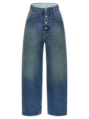 Women > Clothing > Jeans Stonewashed cotton denim jeans with contrast stitching, a high waist, straight leg, front button closure, pockets, White Stitch Line, and Numeric Signature MM6 back logo2 tag. Composition: 100% cotton.