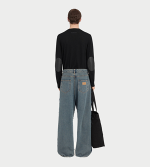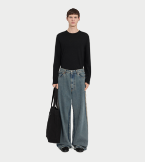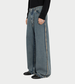Cut with dramatic volume, these washed denim trousers feature exposed side seams and raw-edged insets in a tonal contrast. The style is finished with the MM6 signature white stitch line at the back. Vendor Color: Blue. Vendor Style: SH0LA0025 S30844 963. Fabrication: 100% cotton. Made in Italy.