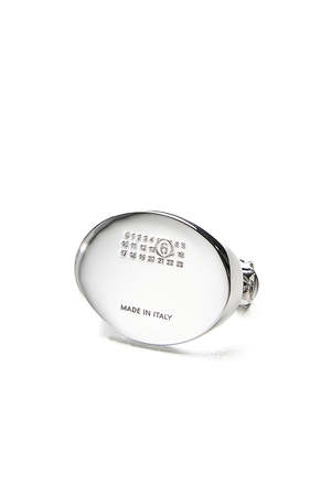 A sculptural update on a classic insignia style, this oval earring recalls the shape of a signet ring, flattened, oversized, and curved to the lobe. The Maisons numeric signature is engraved at the front, creating a subtle yet singular emblem. 100% silver-toned brass Secondary material: 100% silver.