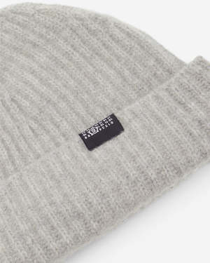 Wool ribbed beanie recalling the sturdy fisherman knit, treated with a soft wash for a cashmere-like feel. Designed for versatile wear, it is completed with MM6s numeric label at the front. Gauge 7 Ribbed knit texture Logo tag on the front cuff White stitch line at the back Main: 80% Wool, 20% Polyester. Made in Italy. Style No. SH0TB0006 M13219 800M.