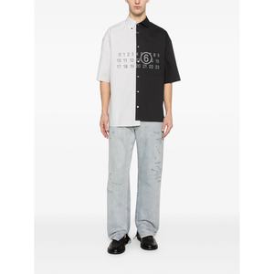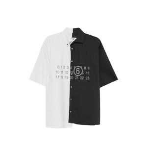 Men > Clothing > Shirts White pinstripe panelled shirt featuring a chest patch pocket, number print, and button fastening.
