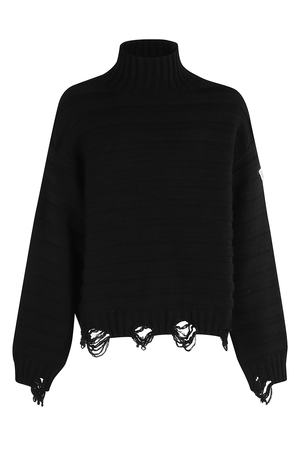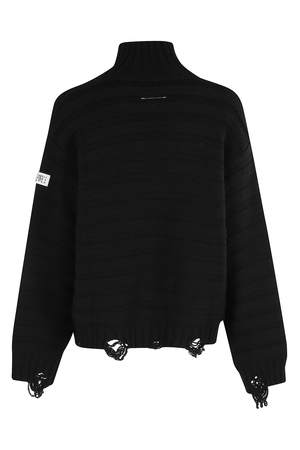 This pullover by MM6 Maison Margiela features a black color, long sleeves, a high neck, and frayed detail at the bottom.