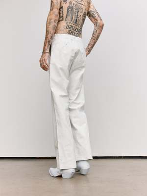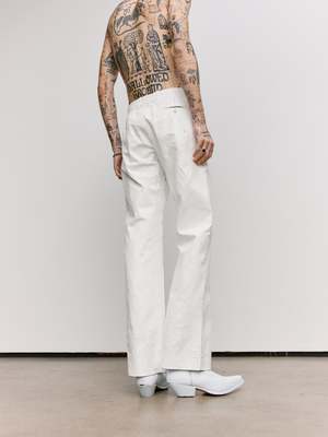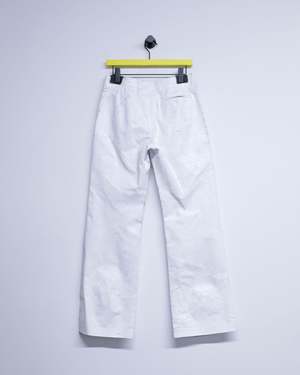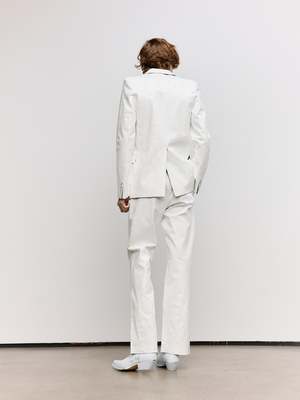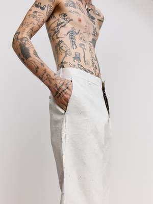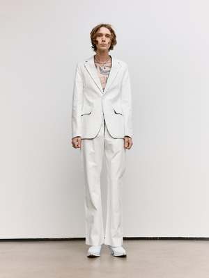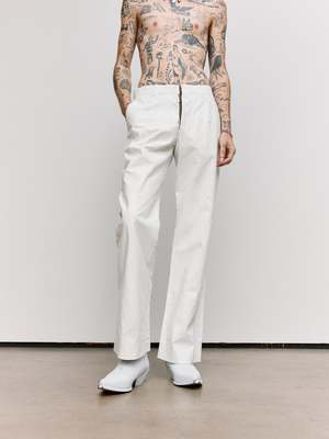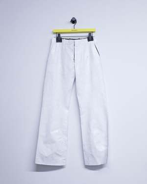 At once concealing and revealing, these tailored trousers reference the Maison's heritage and archival use of white paint. The check print emerges subtly in the interior pockets, a quiet reference to tradition beneath the surface. The MM6 white stitch line at the back completes this study of re-contextualised design, where layers blur the line between past and present.