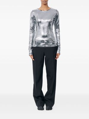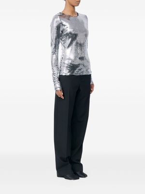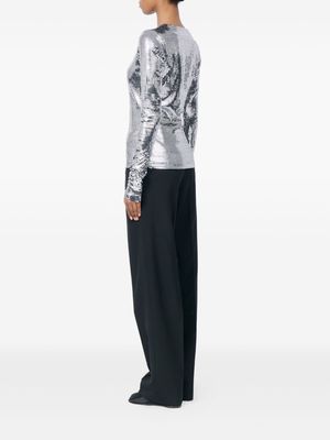 Women > Clothing > Topwear > Tank Tops Silver-tone grid pattern, long sleeves, crew neck. Composition: Elastane, Metallic Fibre, Polyamide.