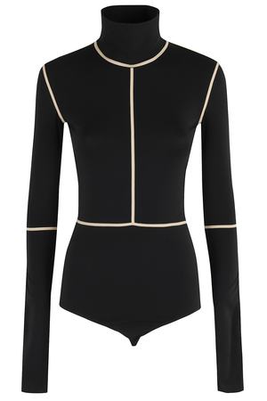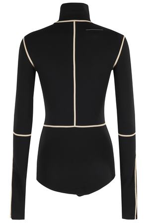 This bodysuit by MM6 Maison Margiela features a black color with contrasting beige piping, a high neck, long sleeves, and a snap bottom closure. Made from stretch cotton jersey fabric.
