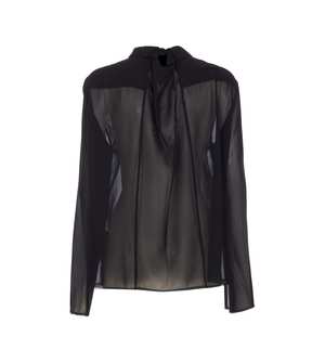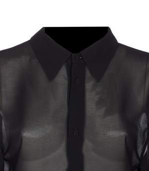 MM6 Maison Margiela black shirt with button closure, long sleeves, regular collar, and a transparent effect. Composition: 100% Polyester.