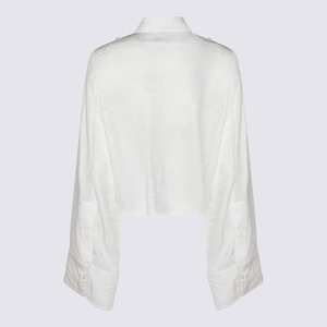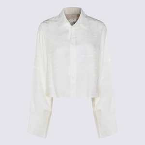 Women > Clothing > Topwear > Shirts White shirt from MM6 Maison Margiela featuring a regular collar, button fastening, long sleeves, all-over logo2 stamp, and a cropped length. Composition: 48% Acetate, 42% Viscose.