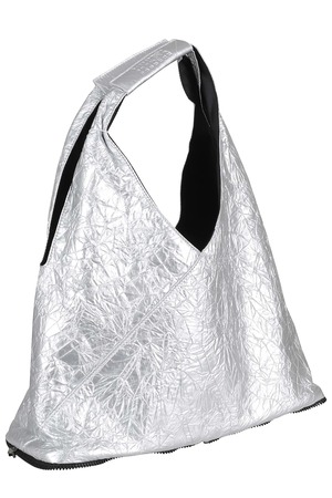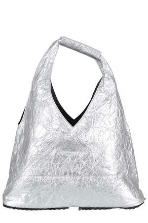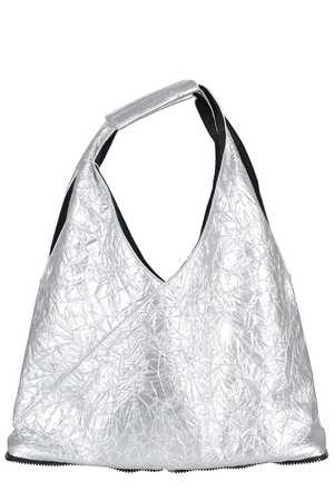 Women > Bags > Totes Category: Bag Article: Japanese bag by MM6 Maison Margiela in a silver, crumpled metallic-effect finish with zip-around detail and inside snap closure. Size and fit: Height: 23 cm Width: 37 cm Depth: 15 cm