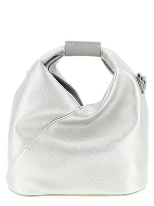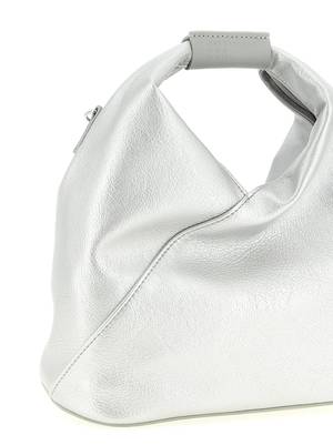 Women > Bags > Shoulder Bags "Japanese Mesh" hammered fine leather crossbody bag featuring a fixed handle with embossed numeric MM6 signature, internal snap button closure, back white stitch line, and an adjustable, removable shoulder strap. Composition: 100% polyurethane.
