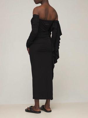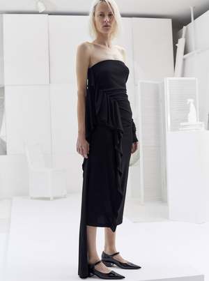 The Strapless Dress in black is worthy LBD contender. A ruched panel runs through the right sleeve and down across the waist creating visual intrigue to the onlooker. Sleeveless can be worn on, scrunched up or long, or kept off for a tube dress look with flowing panels (or, as a scarf, for the bold stylists.) Made in Italy. DETAILS Fabric | 100% Viscose Jersey (unlined) Color | Black Designer | MM6 MAISON MARGIELA FIT & SIZING Take your true size. Size Medium Bust: 22in Bust (fully stretched): 36in Waist: 28in Waist (fully stretched): 38in Sleeve length: 44in Length: 61.5in CARE Hand wash. Lay flat to dry.