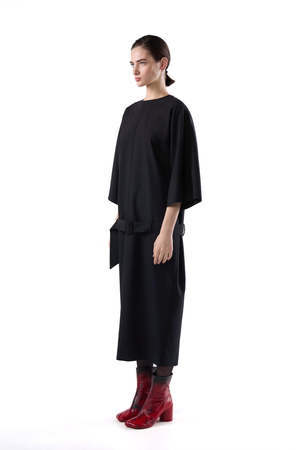 This midi dress features short sleeves, a belted waist, a round neck, and a concealed zip fastening. 100% Virgin Wool.