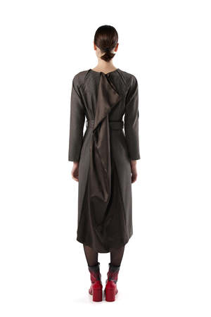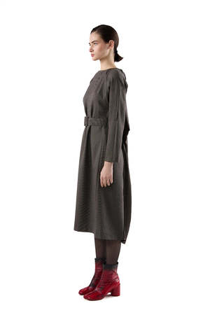 This distressed wool dress features a belted waist and comes in two versions: one with long sleeves and a satin back, and another sleeveless with a belted waist. Virgin Wool 100%.