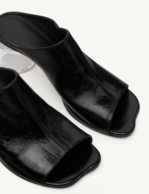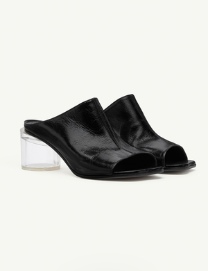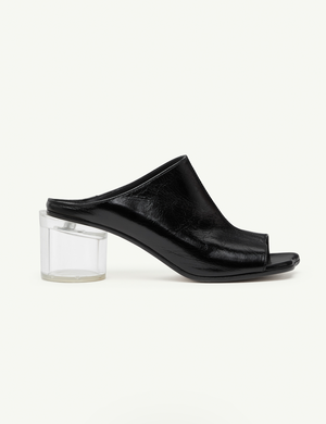 Crafted in wrinkled calf leather, this open-toe mule is shaped by MM6s distinctive Anatomic stitch toe. A transparent cylindrical heel contrasts with the soft, sculpted upper, balancing architectural precision with subversive detail. Details: - By MM6 Maison Margiela - Upper: 100% calf leather - Lining: 100% calf leather - Inside: 100% calf leather - Sole: 100% calf leather - Contrast: 100% rubber - Cylindrical transparent heel - Open toe - Made in Italy - Type: Shoes