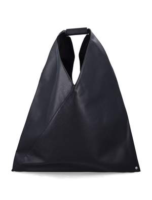 Women > Bags > Totes The MM6 Maison Margiela Japanese Bag has become an icon, inspired by origami with its folded triangular silhouette. This edition is crafted from leather-effect material and features side snap buttons that allow for shape transformation, embodying the Maison's deconstructive spirit. Finished with a debossed numeric top handle and the signature white stitch line at the back. - Triangular silhouette with geometric folds - Leather-effect construction - Debossed numeric top handle - Side snap buttons to adjust shape - Signature white back stitch - Height: 35 cm - Width: 50 cm - Handle drop: 13 cm Composition: 100% polyurethane; lining: 100% cotton.