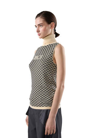 This turtleneck sleeveless top features a geometric pattern and ribbed-knit edges. 100% Cotton.