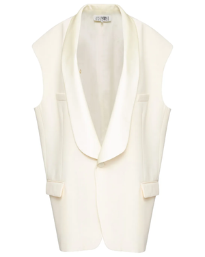This oversized tailored waistcoat by MM6 is the perfect elevated staple. Featuring two front flap pockets and button closure, in the most beautiful buttercream color for spring! Details: - By MM6 Maison Margiela - Pale Yellow - Made in Italy - Polyester 55%, Virgin Wool 45% - Oversized Fit