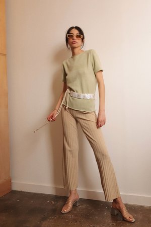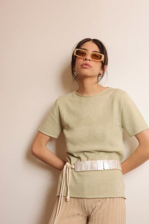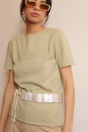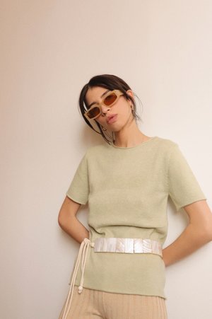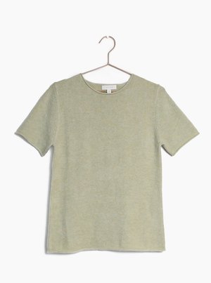 This ultra soft sage knit top features short sleeves a round neck and the comfortable feel of a sweater. A perfect closet staple. Great for in and out of the office. - length: 24" - 64% acrylic - 26% polyester - 10% nylon - imported